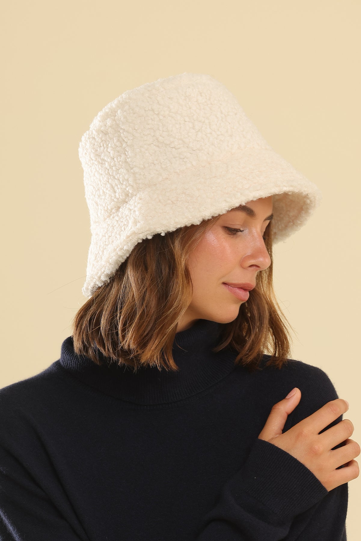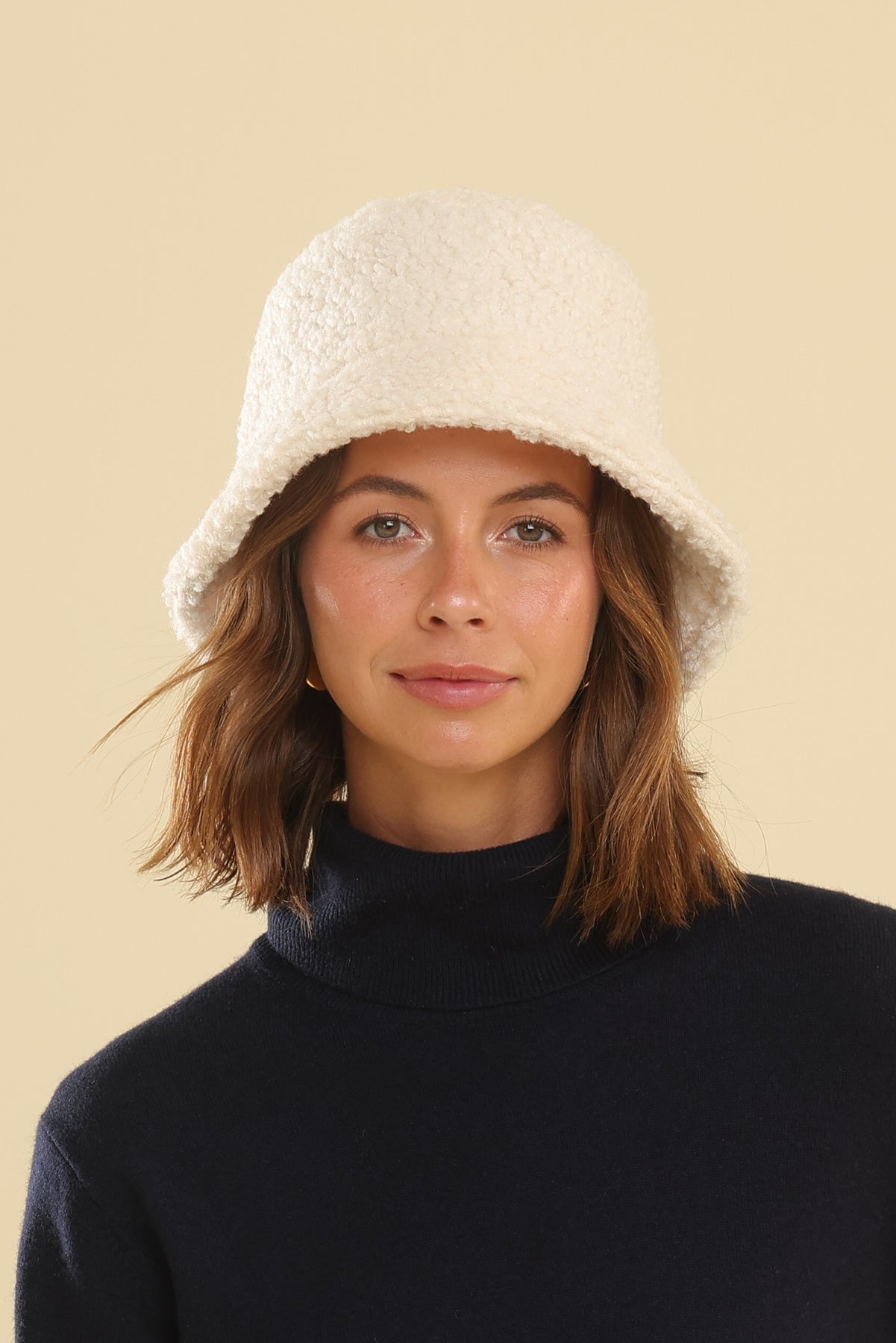 The Morgan and Taylor Drew Bucket Hat in cream stands out from the crowd with a curly wool-like textured finish. The soft feel piece will keep you snug; with tonal fully lined inner.