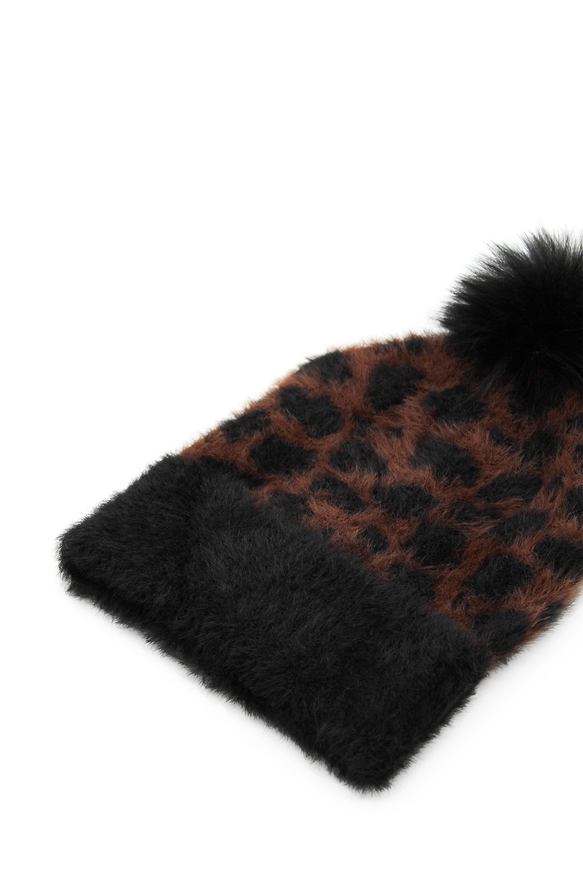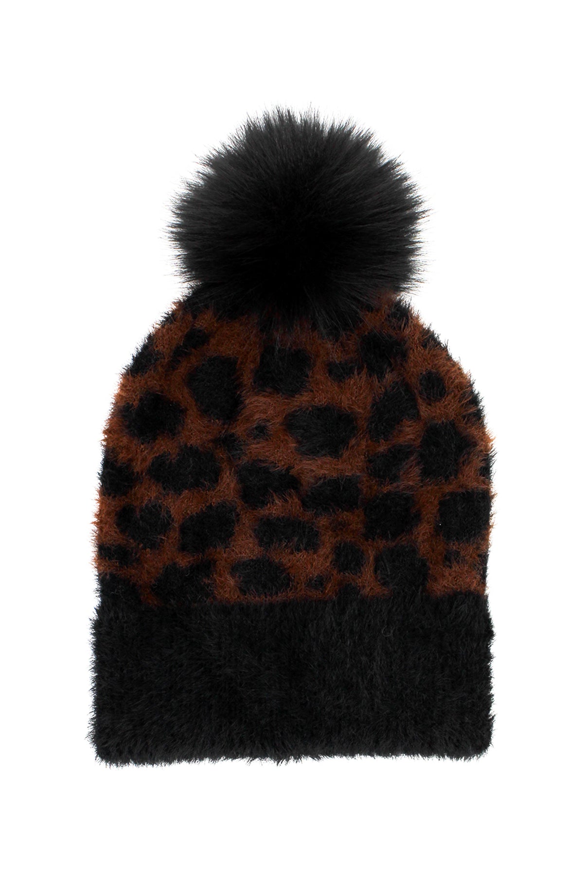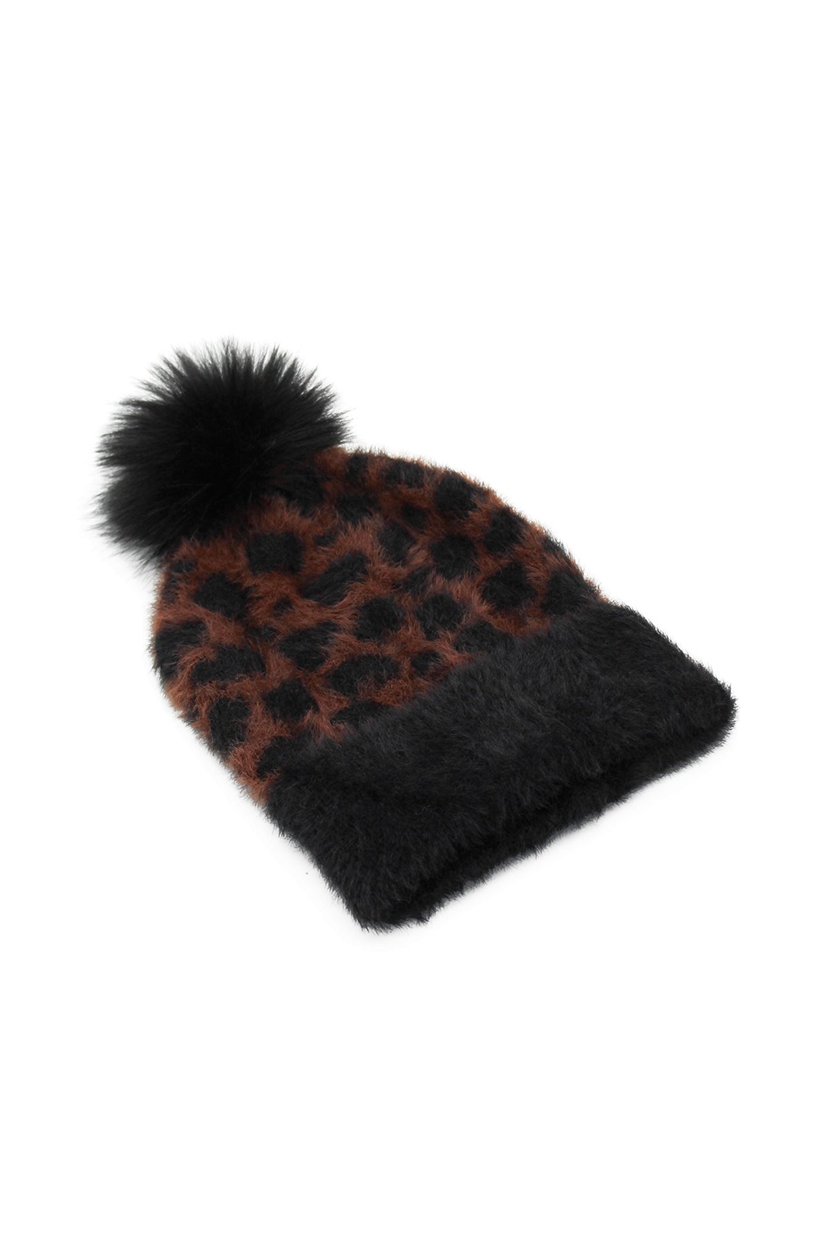 Designed with a fun and fluffy pom pom on the crown, a tonal animal print weave and a chunky, folded cuff, the beanie will be a trendy, Winter go-to.