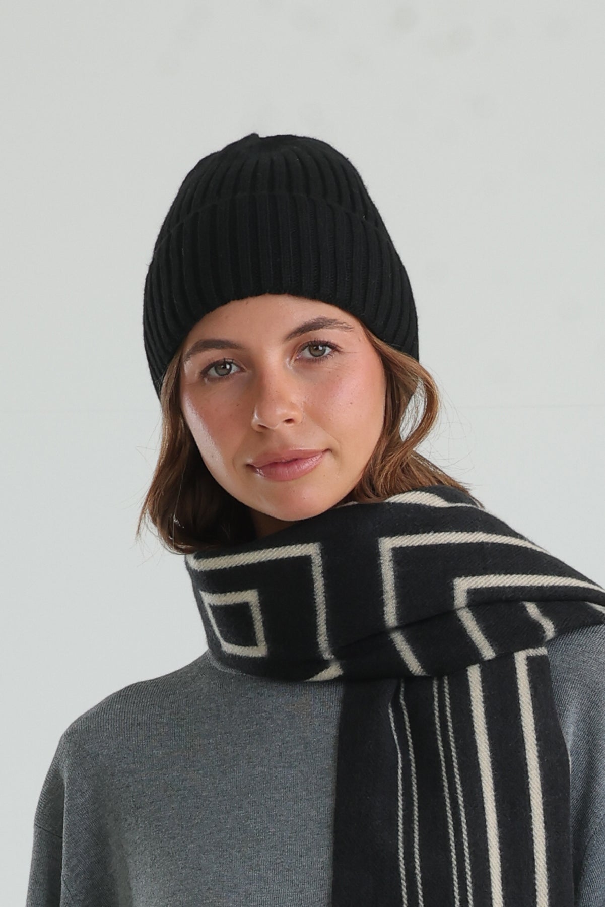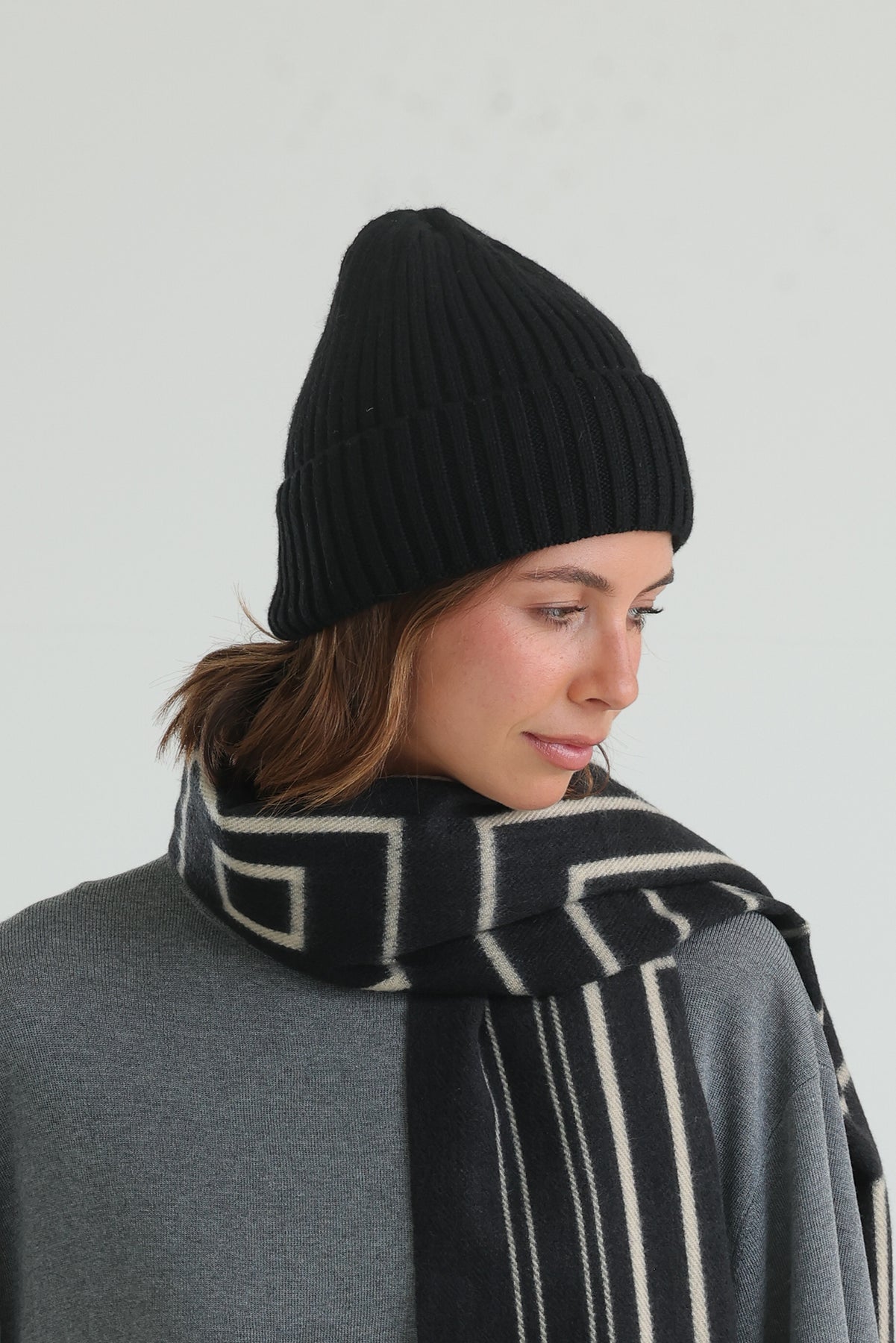 The Morgan & Taylor Mia Beanie in black, is a soft, wool-blend beanie. Made with ribbed knit details and a wide fold-over cuff, the Mia Beanie can be easily styled to many looks, a chic winter essential.