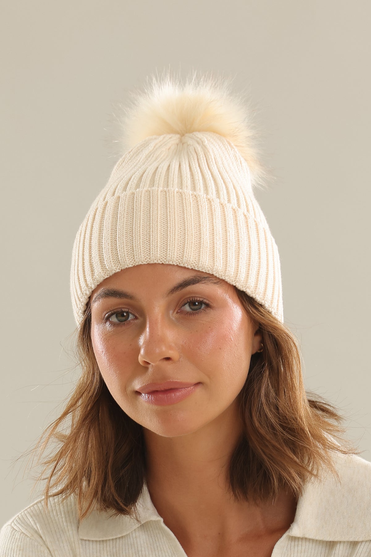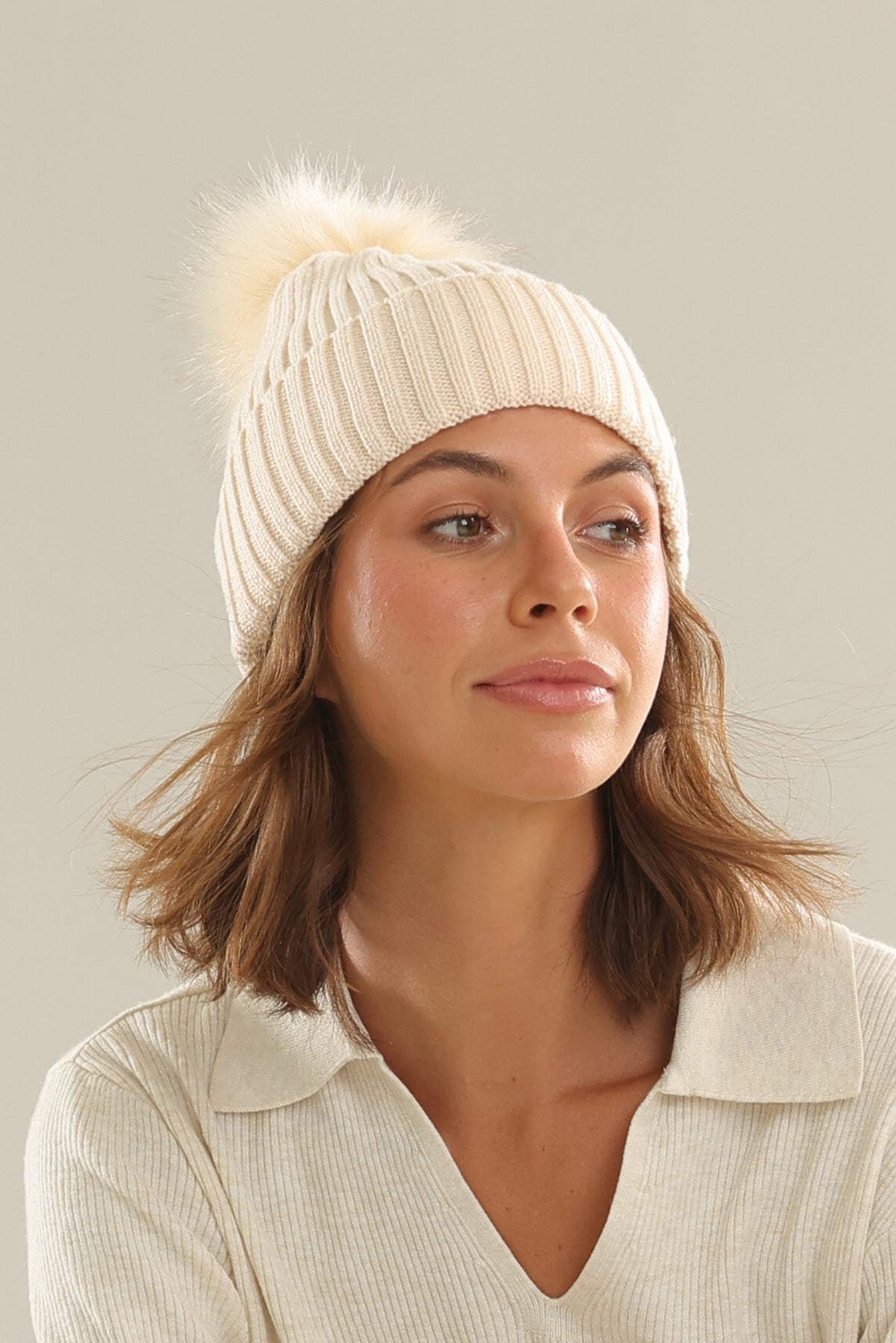 The Morgan & Taylor Valentine Wool Blend Beanie in Cream Bisque is a timeless and dependable winter essential. With a classic silhouette, the vertical ribbed detailing and fun faux fur pom-pom can be easily styled to a number of looks.