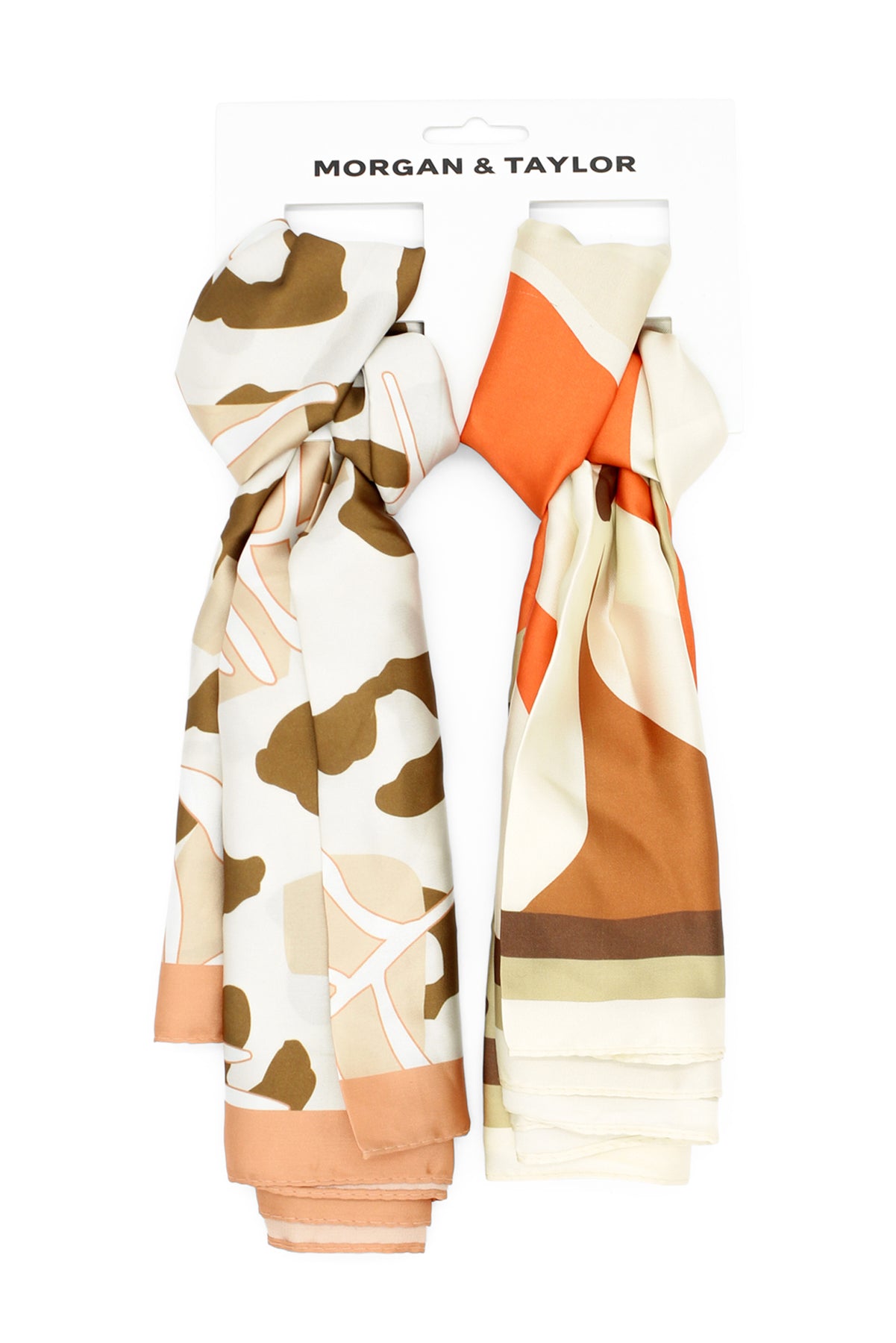 The Morgan & Taylor Nia Hair Scarf Pack in Brown and Orange is a chic and practical collection. The set includes two chic hair scarves that can be styled separately or as a set for an extra layer of luxury. Both scarves have a different pattern and colourway. Made from 100% polyester.