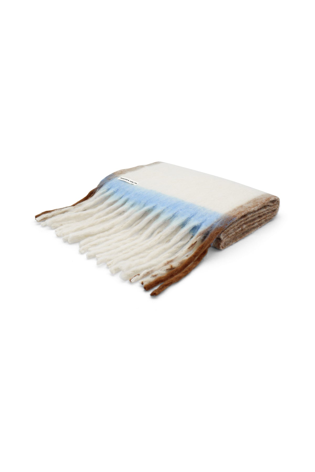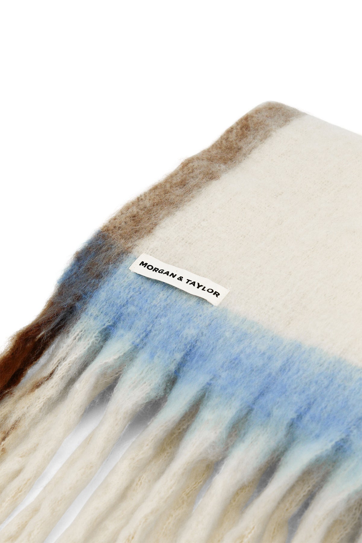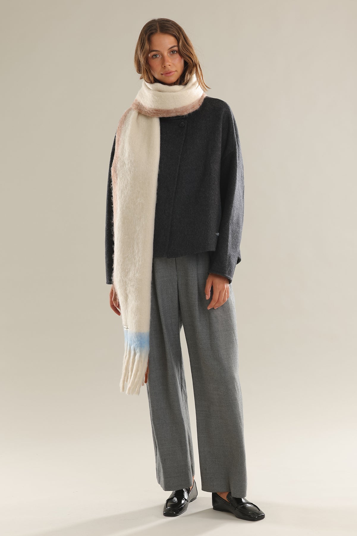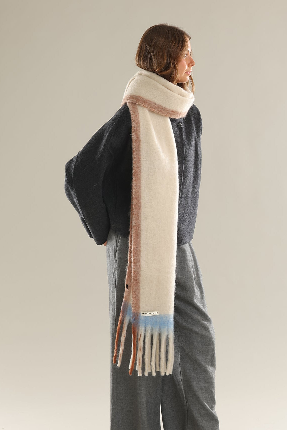 The design features a contrasting stripes across the edges of the scarf, and is finished with neat fringe detailing along the two short edges. The warm scarf can be easily styled to a variety of looks, making it a go-to piece during the colder months.