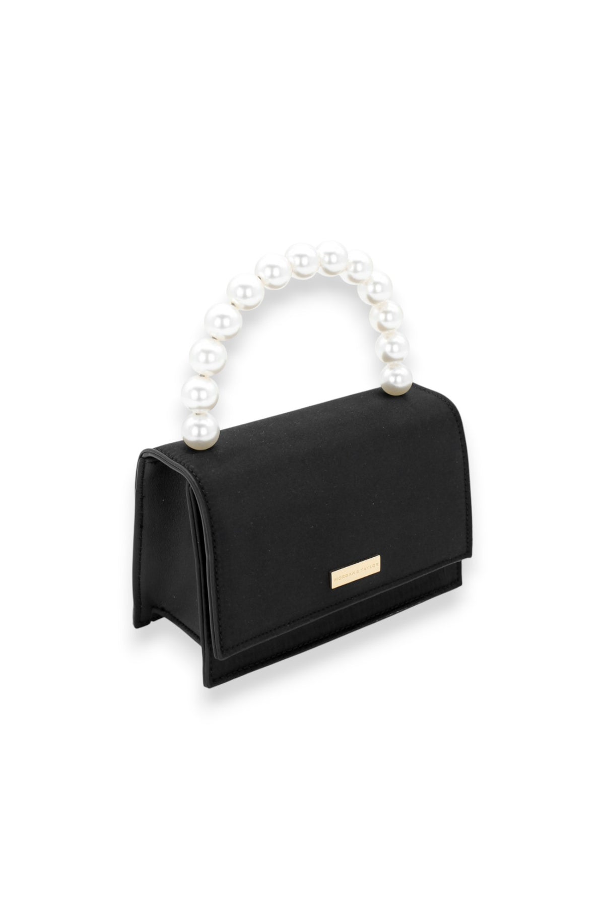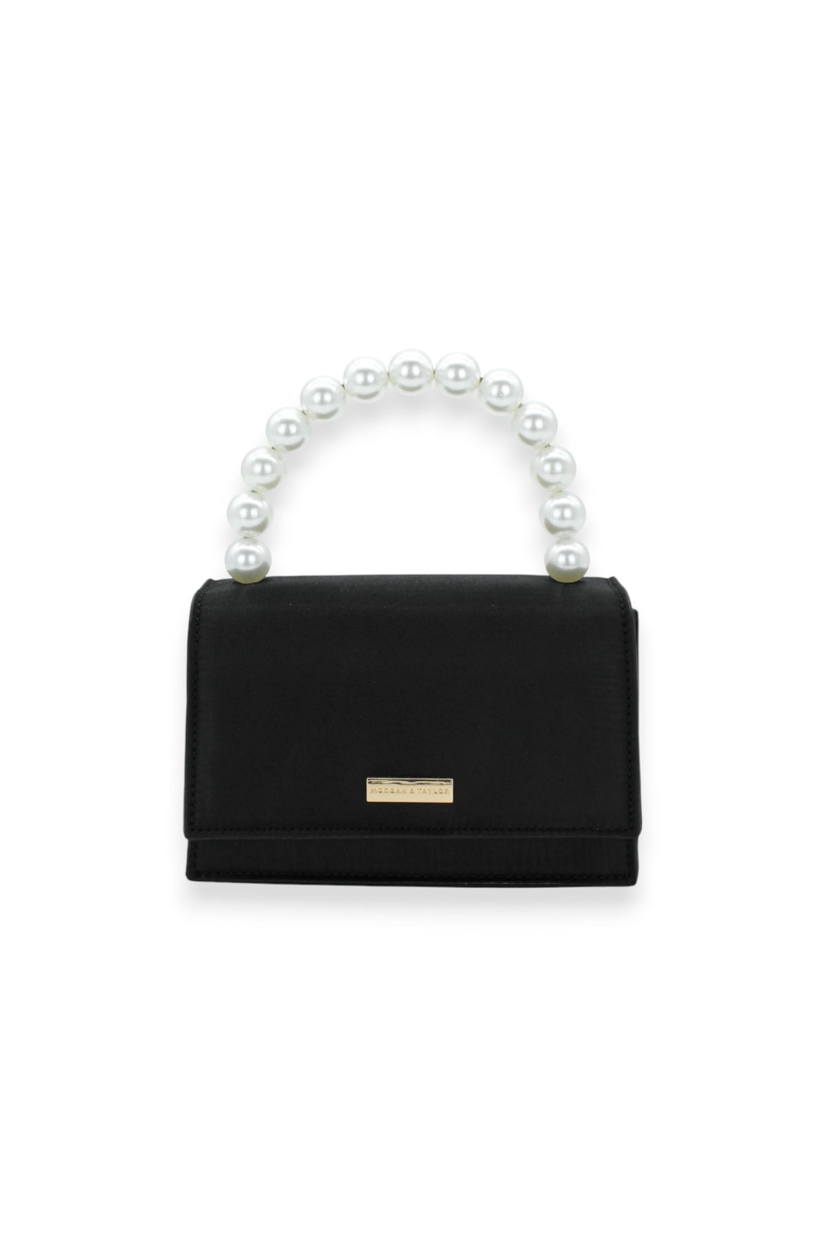 The Morgan and Taylor Melanie Top Handle Bag in Black is a modern and elegant piece. Featuring a chic, curved pearl handle and finished with a super soft, satin-like fabric, the style is perfect for finishing off any event look. Closed with a magnetic button.