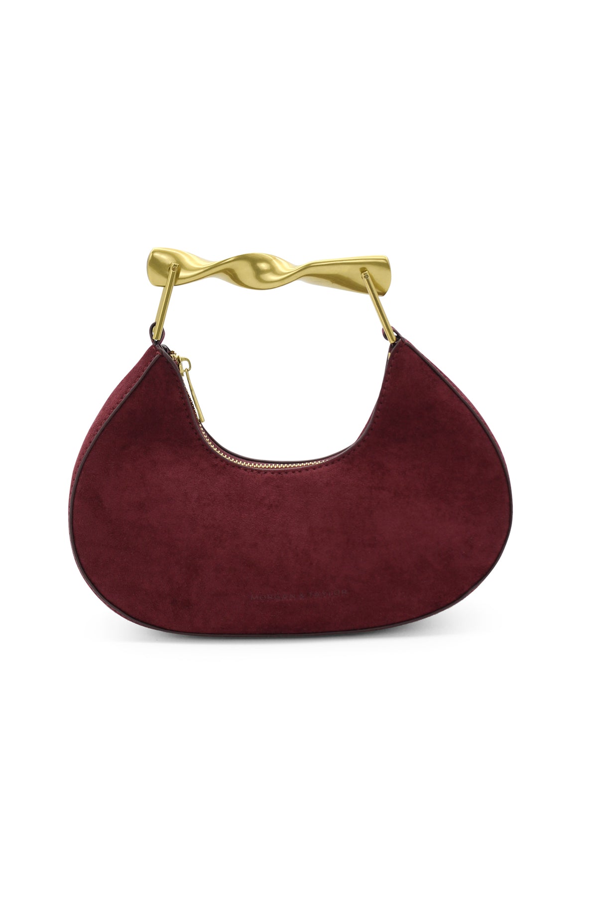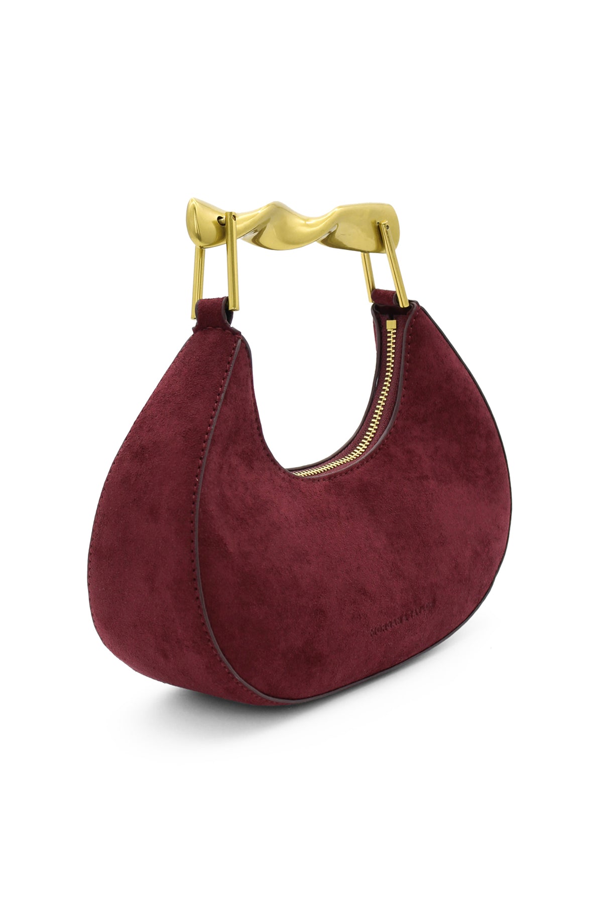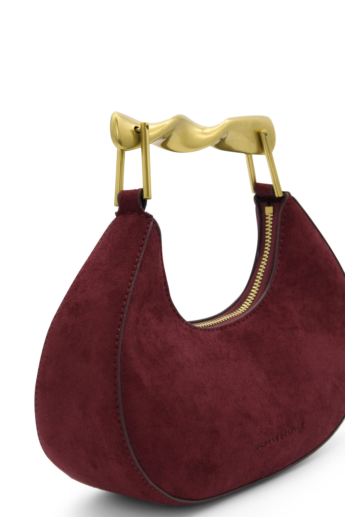 The crescent moon-shaped bag features a suede-like exterior, and is finished with a modern, twisted metal top-handle. The bag is secured with a zip closure.